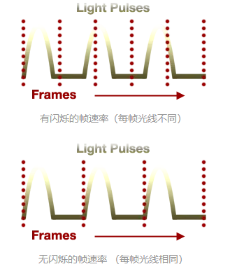 盡管光源的光線看上去是連續(xù)的,但實際上許多光源是以高頻脈沖的形式按著一定時間間隔時斷時續(xù)地來發(fā)光的。當(dāng)快門速度和幀率捕捉到光脈沖的不同部分,就會產(chǎn)生閃爍: