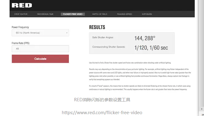 按照供電頻率和幀率,如果想避免閃爍,可能需要設(shè)置非常規(guī)的快門速度。例如,如果在供電頻率60Hz的照明下,你想設(shè)置一個不常用的幀率,比如說7 fps,那189°的快門角度會比較合適(通過前文提到的RED消除閃爍的參數(shù)設(shè)置工具計算得出)。