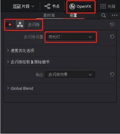 然后點擊[ Open FX ],添加[ 去閃爍 ]效果,去閃爍設(shè)置選擇[ 熒光燈 ]即可,也可以選擇[ 高級控制 ]來調(diào)整得更細(xì)致一些。